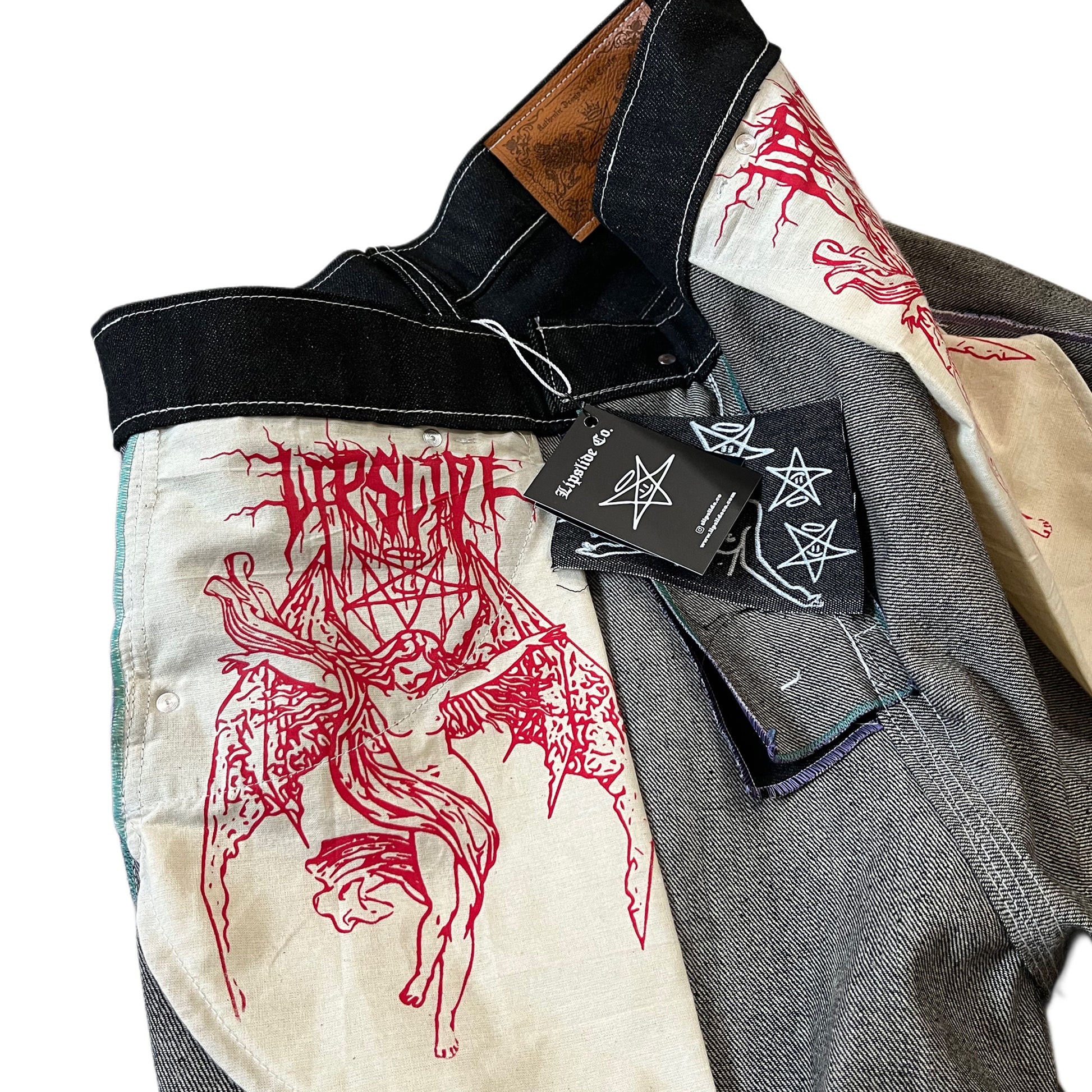 Black washed denim, five pockets, button with brand logo, four old gold rivets, leatherette patch with Lipslide logo, leatherette side label, black and white fabric inner label with lipslide co logo, its pockets on the inside are intervened with exclusive silkscreen printing of the brand.