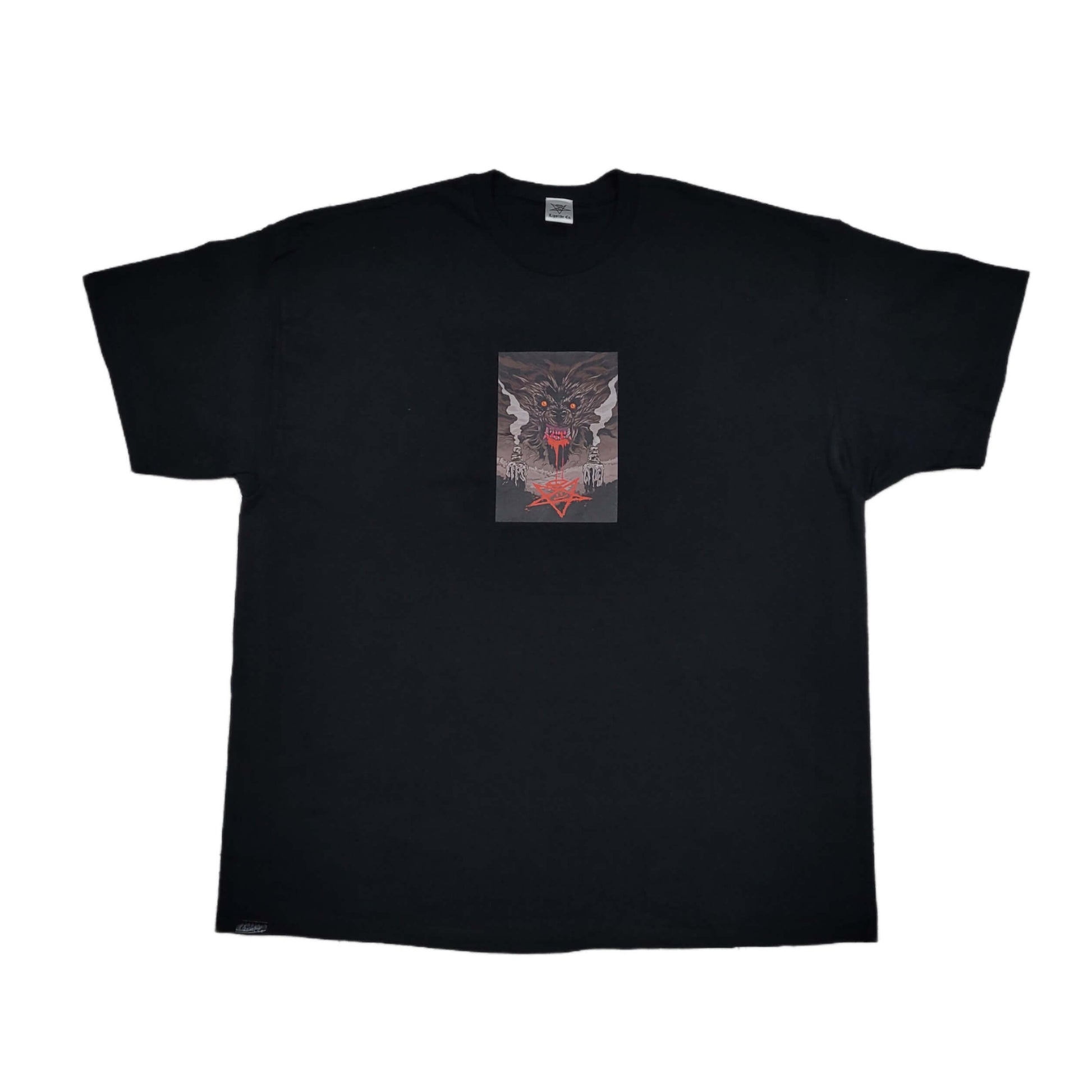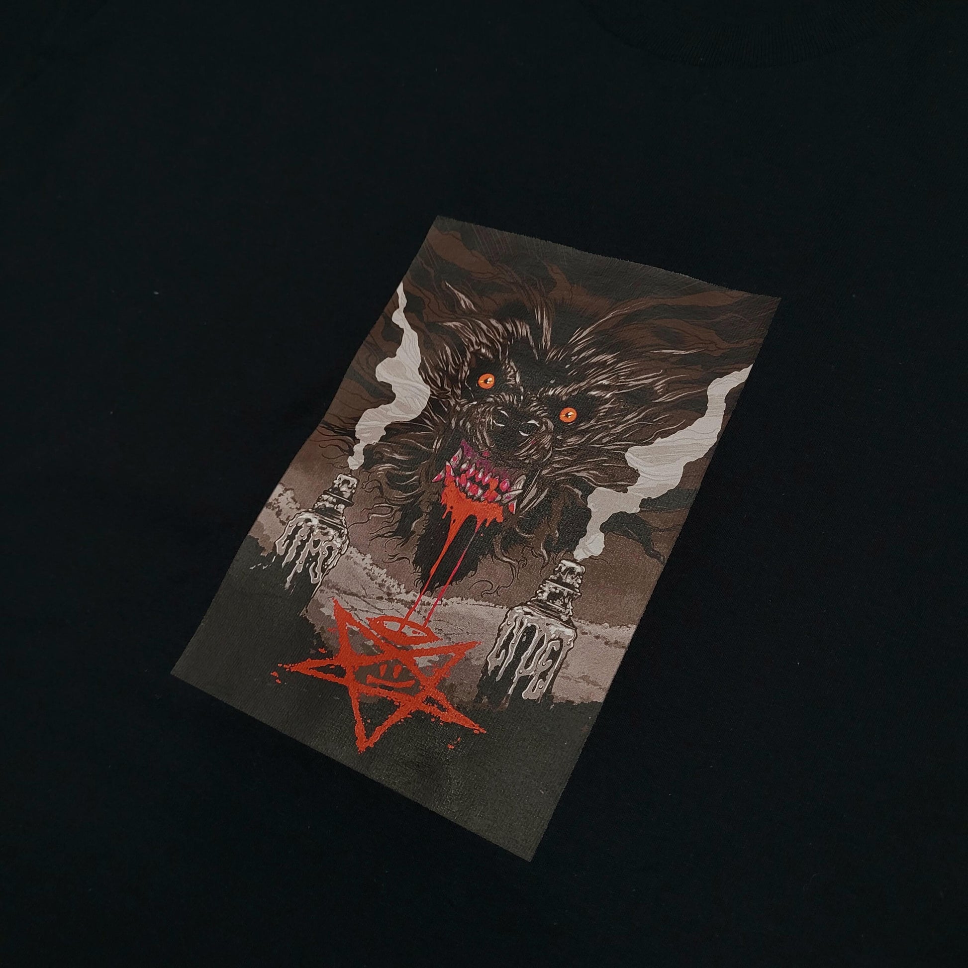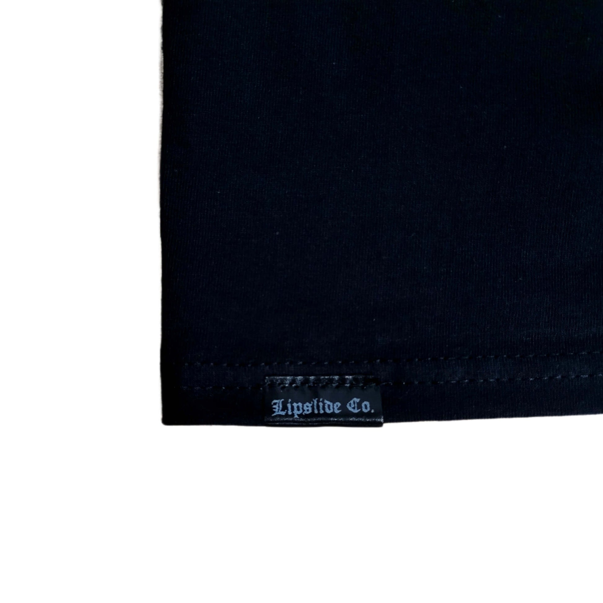 Black T-shirt, 100% cotton, 215 g/m², tubular fabric, double stitching on sleeves and hem, with exclusive lipslide co design on the chest and black label on the bottom with lisplide co logo.