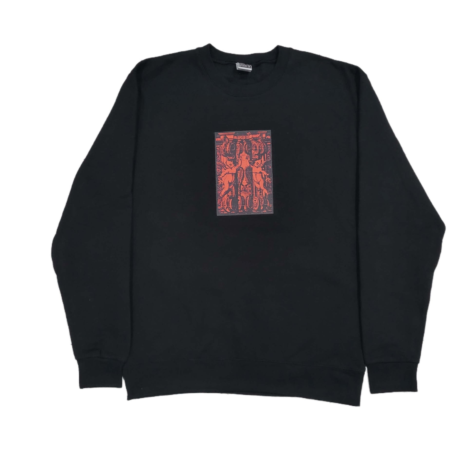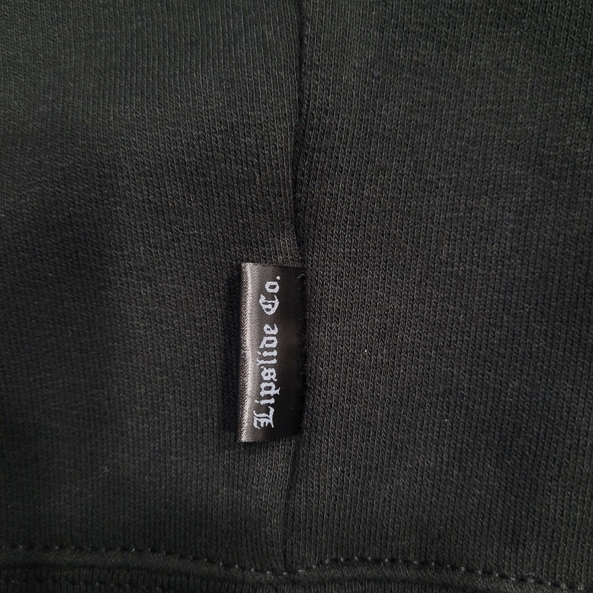 black sweater with unique lisplide design embroidery, 300 g/m², 80% cotton/20% polyester, soft brushed interior, ribbed collar, cuffs and hem.