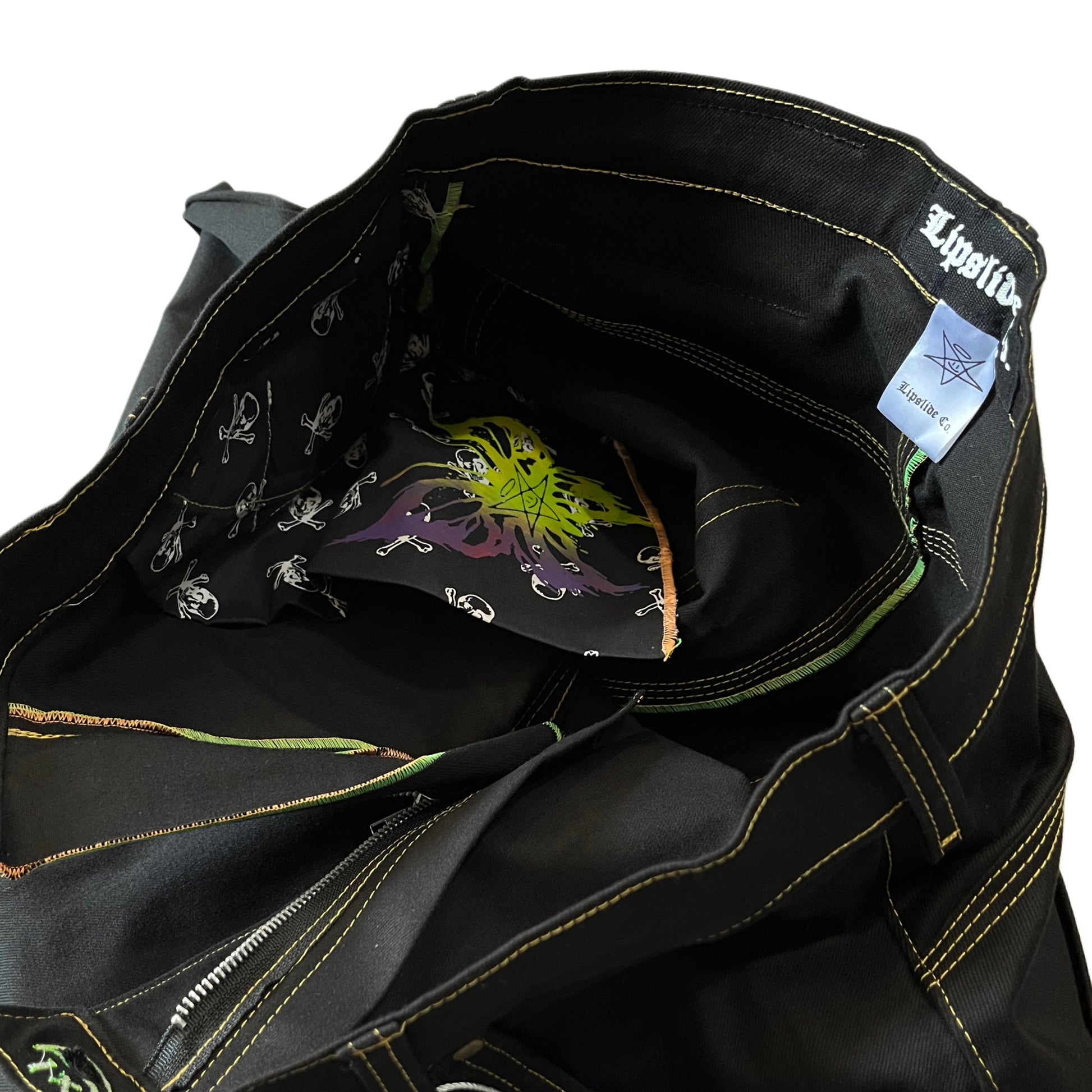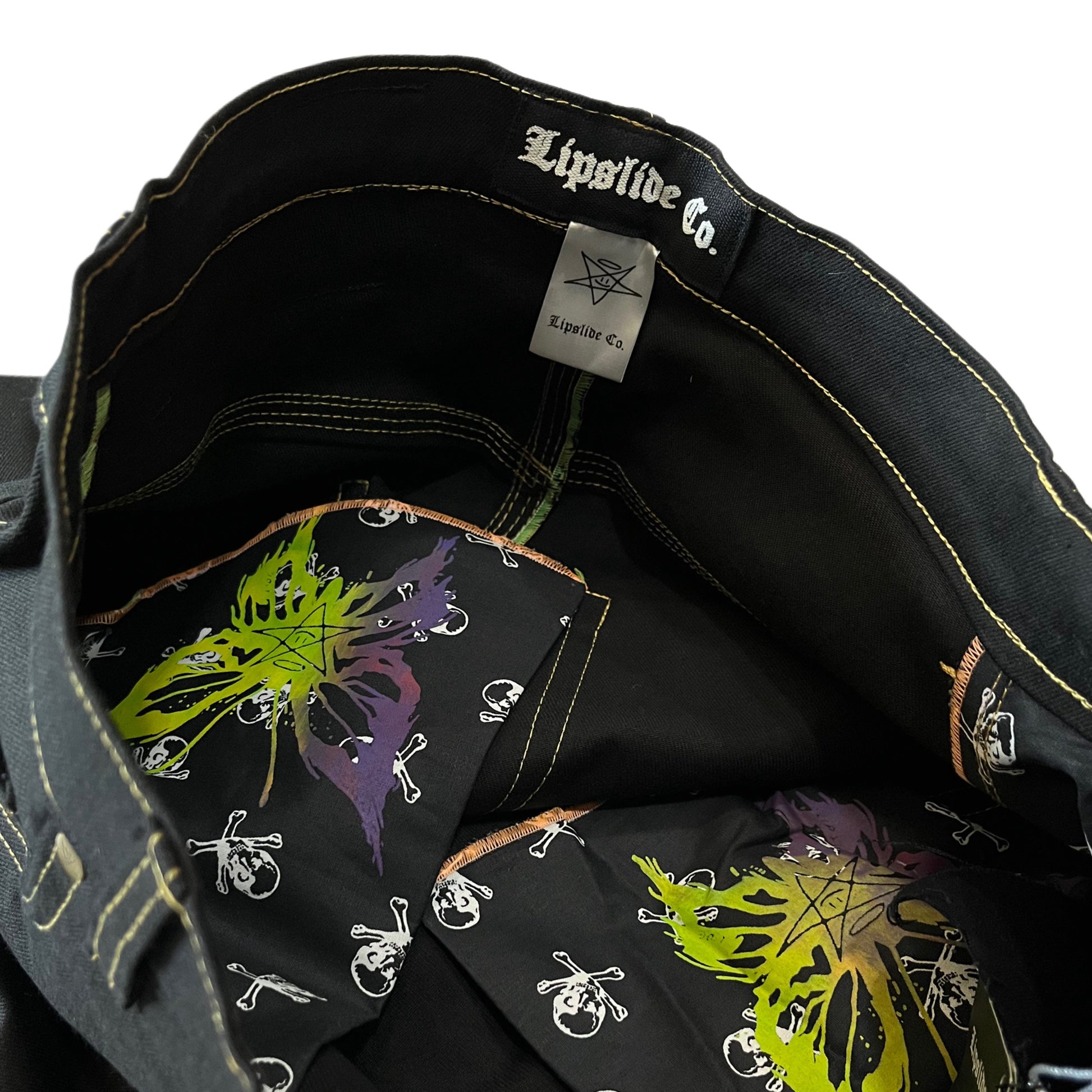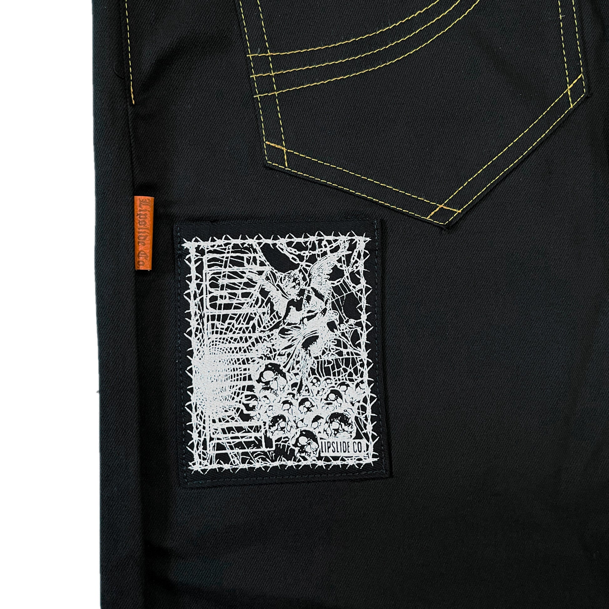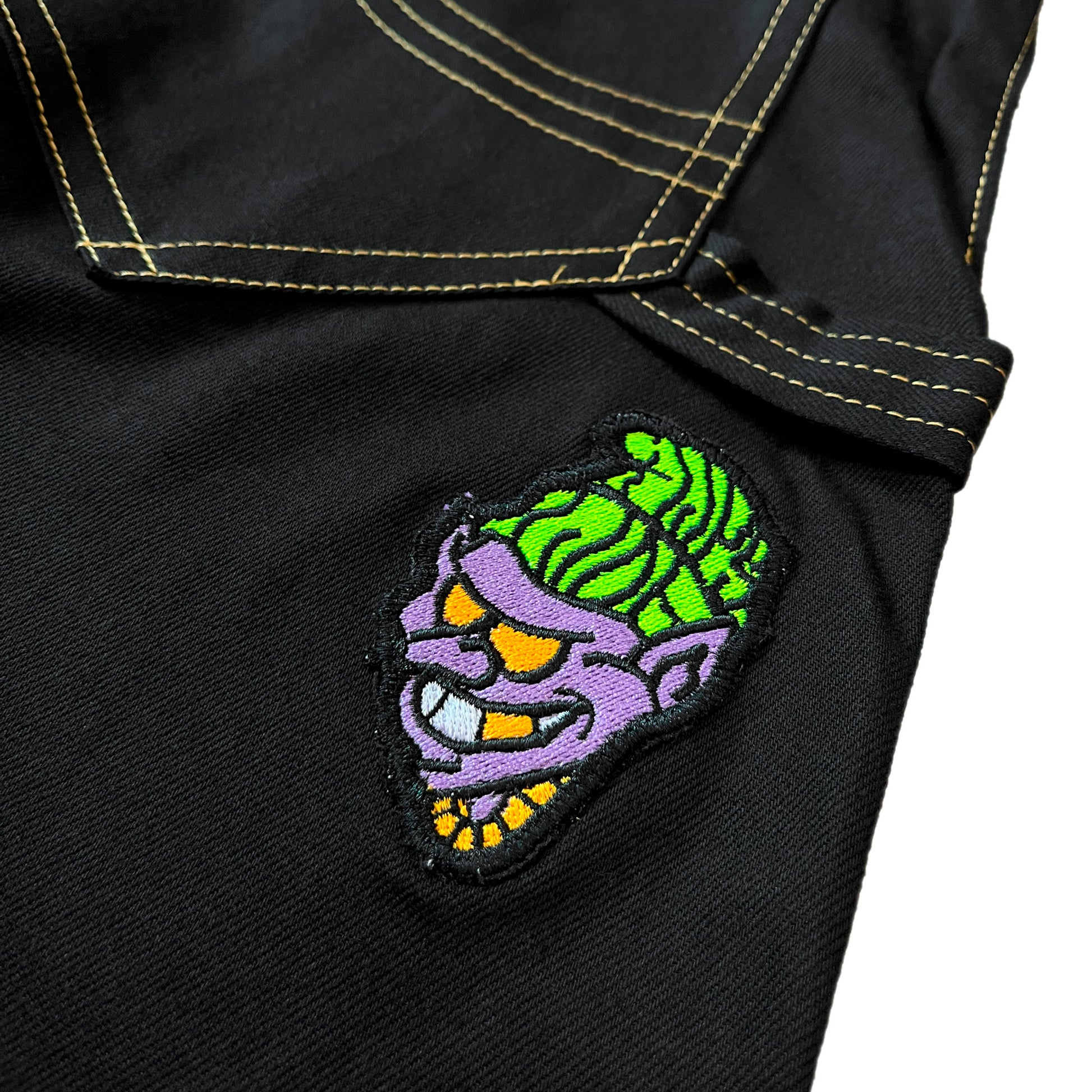 Baggy style pants built in strong 100% cotton denim textile in black, gold stitching, back pockets detailed with gold thread, patch pocket with authentic brand design made in screen printing and an exclusive high quality embroidery and design on the back, its internal details such as its button with the brand logo make these pants a unique and unrepeatable item.