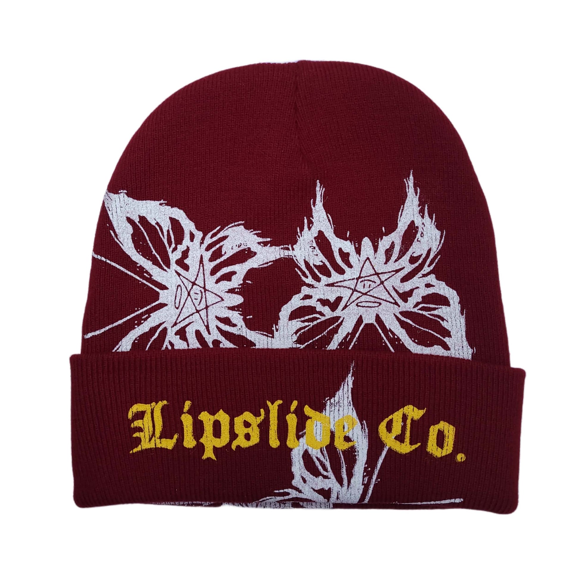 Unique hevyweight red winebeanie with silk-screen printed design.
