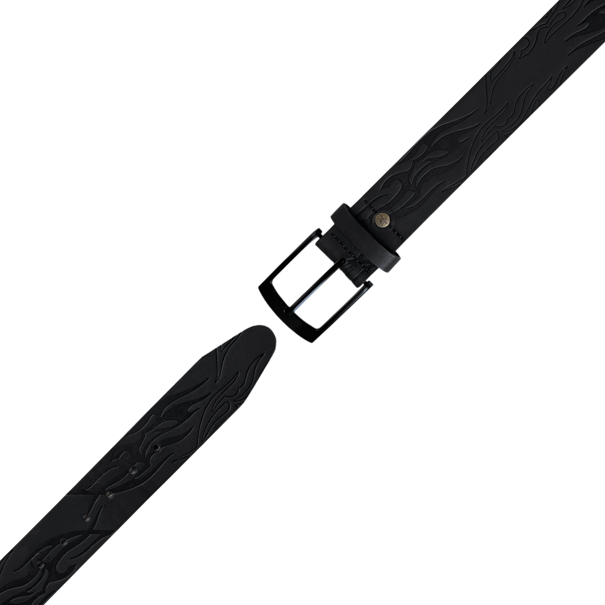 Exclusive belt, rivet with brand logo, 4cm buckle and tribal flame details.