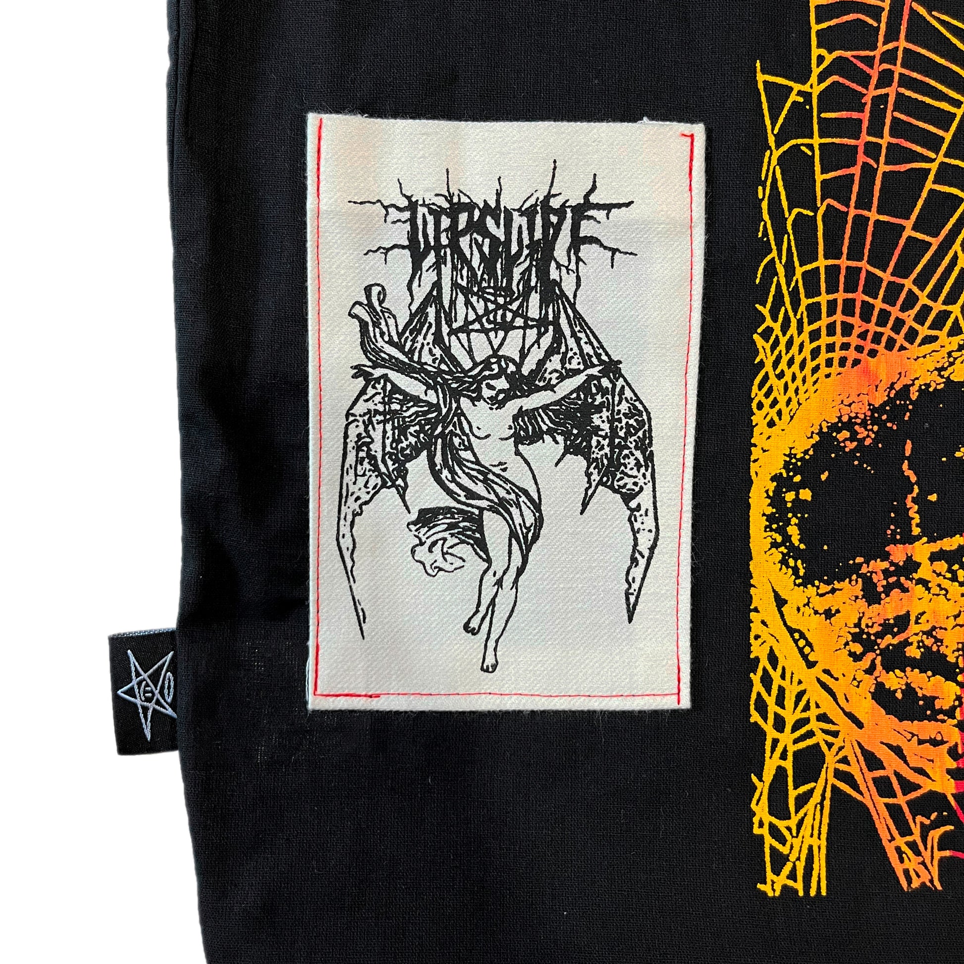 Tote bag exclusive and unique is its design no two are made alike, black bag and intervened with silkscreen printing with brand design, white pocket patch with black silkscreen printing with brand design.